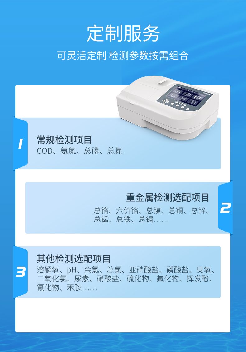 5、多参数水质分析仪可检测项COD参数,支持16mm比色管及24mm比色 瓶两种检测规格,实用性极高。