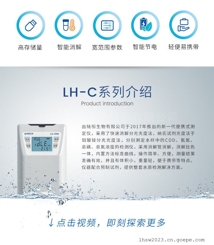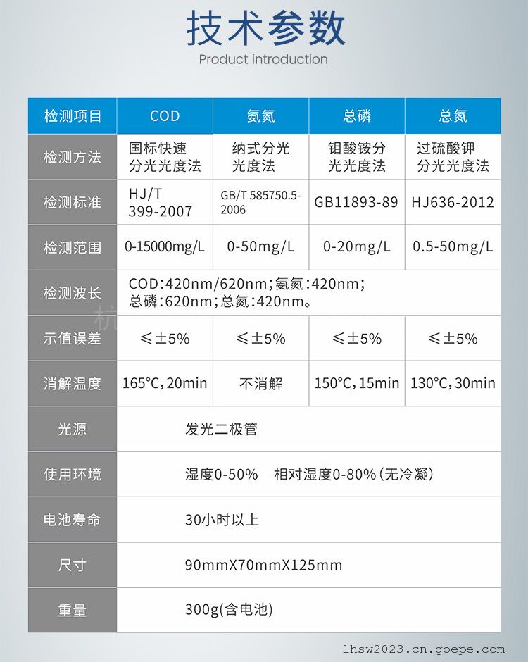 四.技术参数:检测项目 COD 氨氮 氨氮 总磷 总氮 高锰酸盐指数 检测方法 重铬酸钾法 纳氏试剂法 水杨酸法 钼酸铵法 碱性过硫酸钾消解-麝香草酚分光光度法 高锰酸盐法 检测范围 0-15000mg/L 0-100mg/L 0-50mg/L 0-20mg/L 0-500mg/L 0-25mg/L 检测下限 10mg/L 0.05mg/L 0.02mg/L 0.02mg/L 0.5mg/L 0.5mg/L 消解温度 165℃,20min 不消解 不消解 150℃,20min 125℃,30min 100℃,30min 测量精度 ≤±5% ≤±5% ≤±5% ≤±5% ≤±5% ≤±5% 重复性 ≤±3% ≤±3% ≤±3% ≤±3% ≤±3% ≤±3% 波长 420nm/620nm 光源寿命 10万小时 滤光片寿命 5年 存储数据 3000条 电池 5号电池1.5V,2节 使用环境 温度 0-50℃,相对湿度 0-90%(无冷凝) 尺寸 90x70x125mm 重量 300g(含电池)